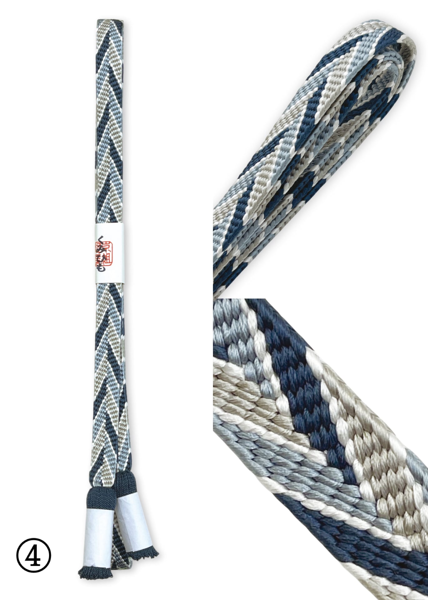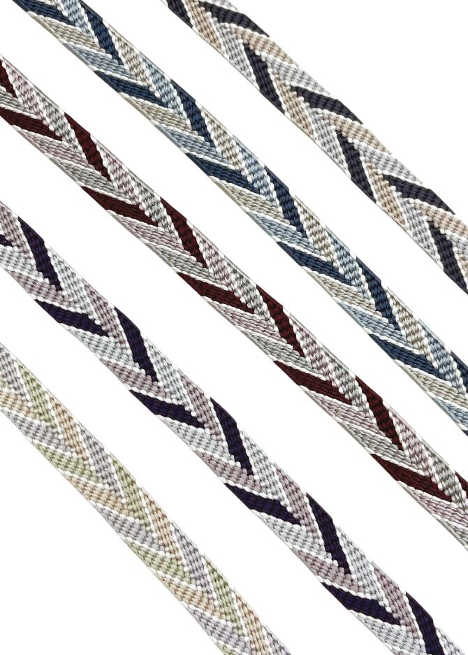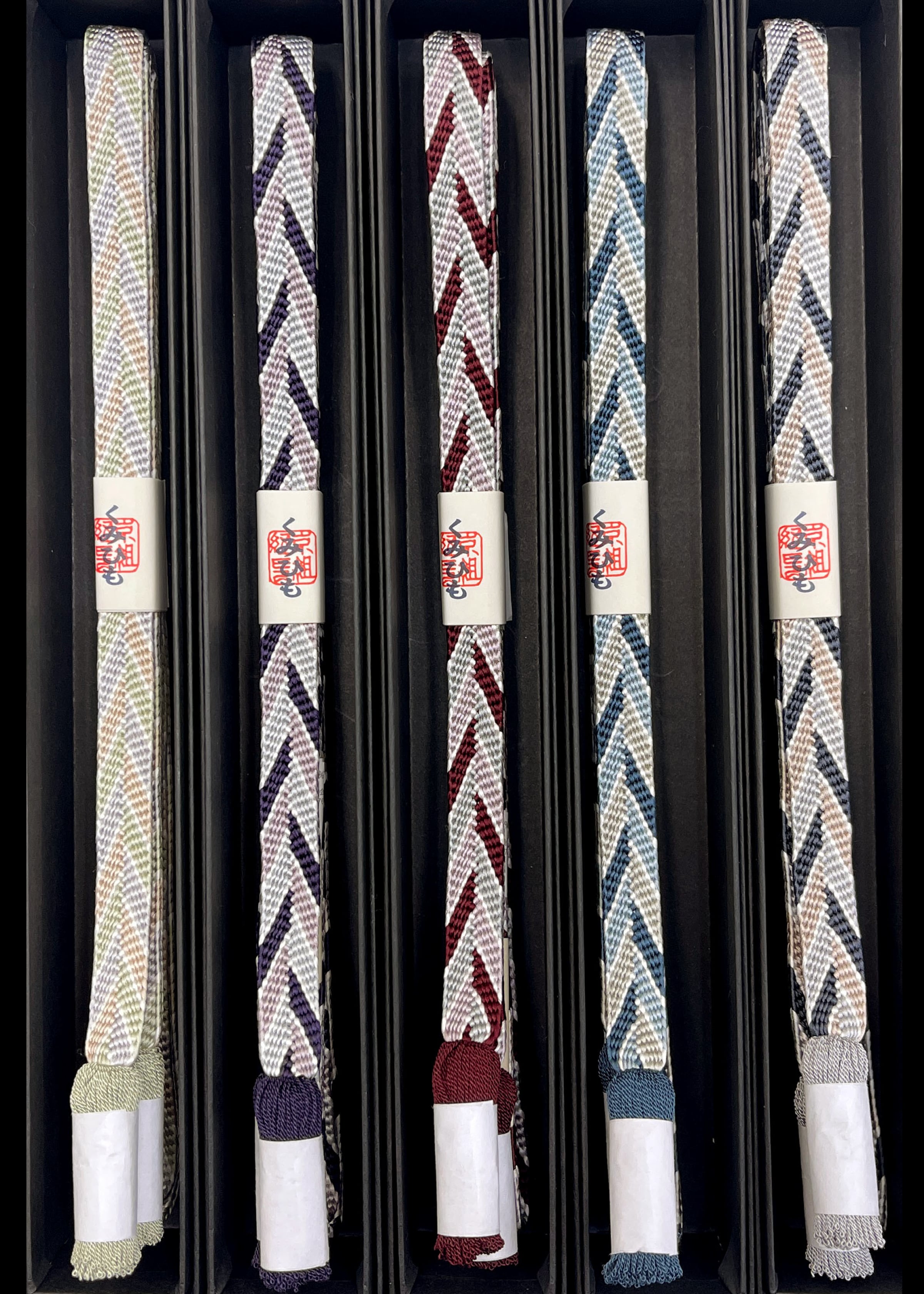 笹浪組は組紐の技法のひとつで、笹の葉が波打つような模様が特徴的な組み方です。規則的なジグザグ模様や矢羽模様にも見える、端正で上品な柄です。平組で幅があり、結ぶと安定しやすいのが特徴です。房の色が、それぞれの帯締のアクセントカラーに合わせて作られており、丁寧な仕上がりとなっております。普段着(小紋・紬)などとコーディネートして、お出かけやお食事など、季節を問わずお使い頂けます。